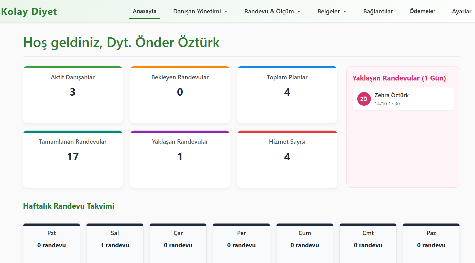 Diyetisyenlerin danışan yönetimi, beslenme planı oluşturma ve ölçüm analizlerini kolayca takip edebildiği profesyonel web paneli.