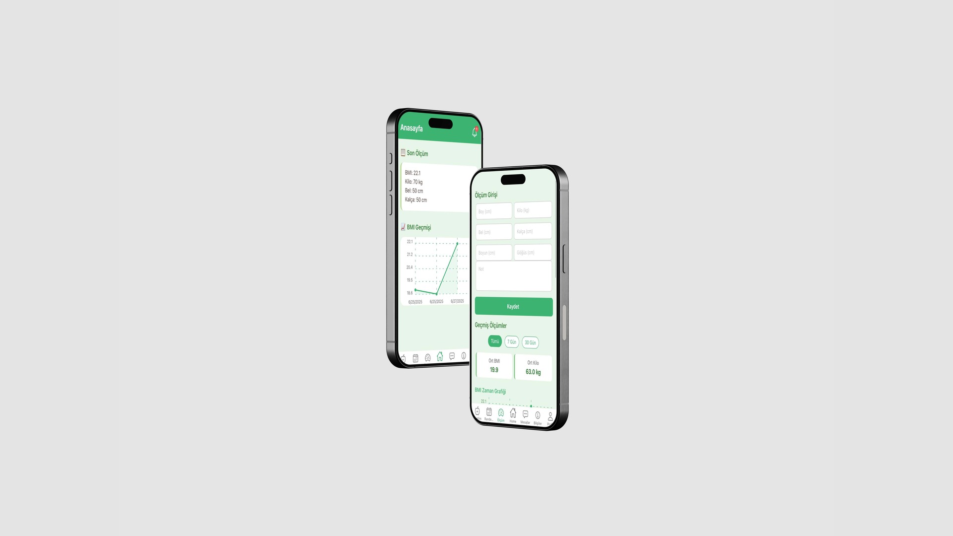 Diyetisyen ve danışanların günlük plan takibi, ölçüm girişi ve iletişimi sürdürebildiği entegre mobil uygulama.